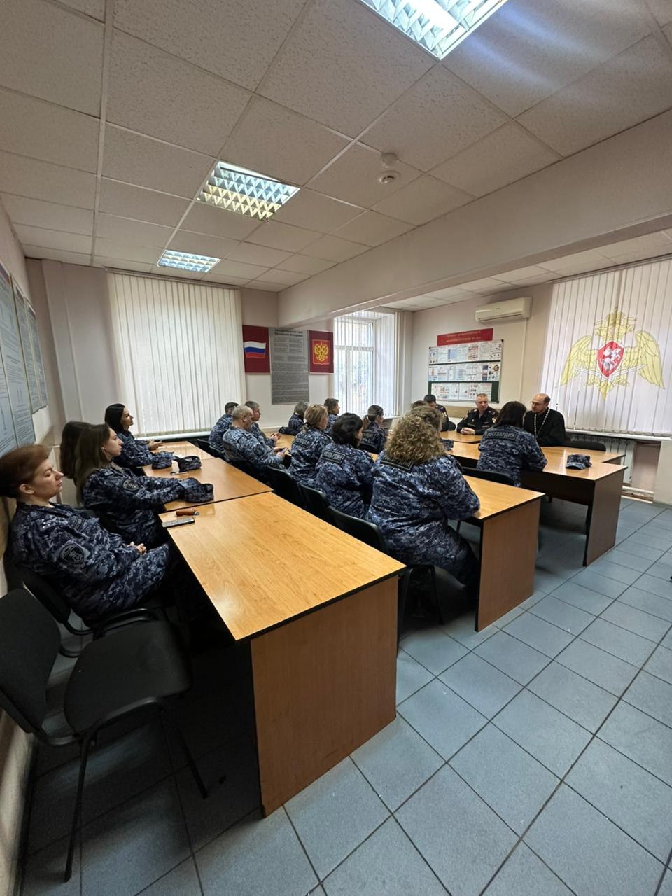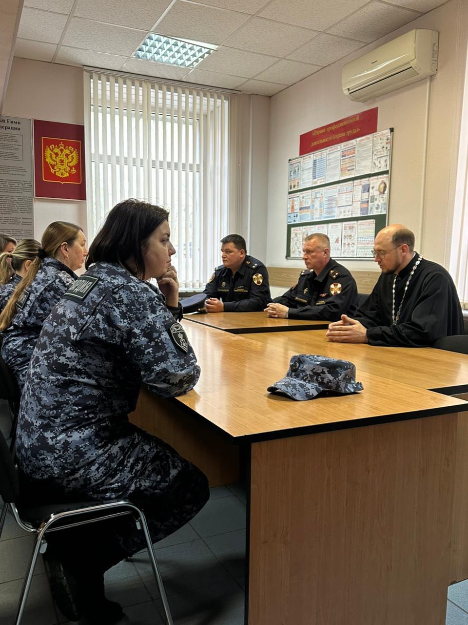 О. Алексей провел беседу, в которой затронул тему патриотизма и русской культуры. Поговорили о формировании духовно-нравственных ценностей и сохранении их в современном обществе. В завершении встречи о. Алексей пожелал сотрудникам успехов и Божьей помощи на службе.